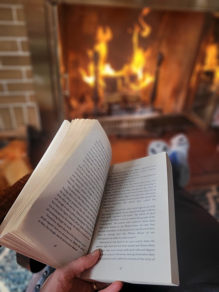 The previous weekend we had a snow storm. It was cold and frosty outside but definitely cozy and warm inside when we had tea and hot cocoa by the fire. I especially liked taking some time to read as I warmed up, my kids did too.