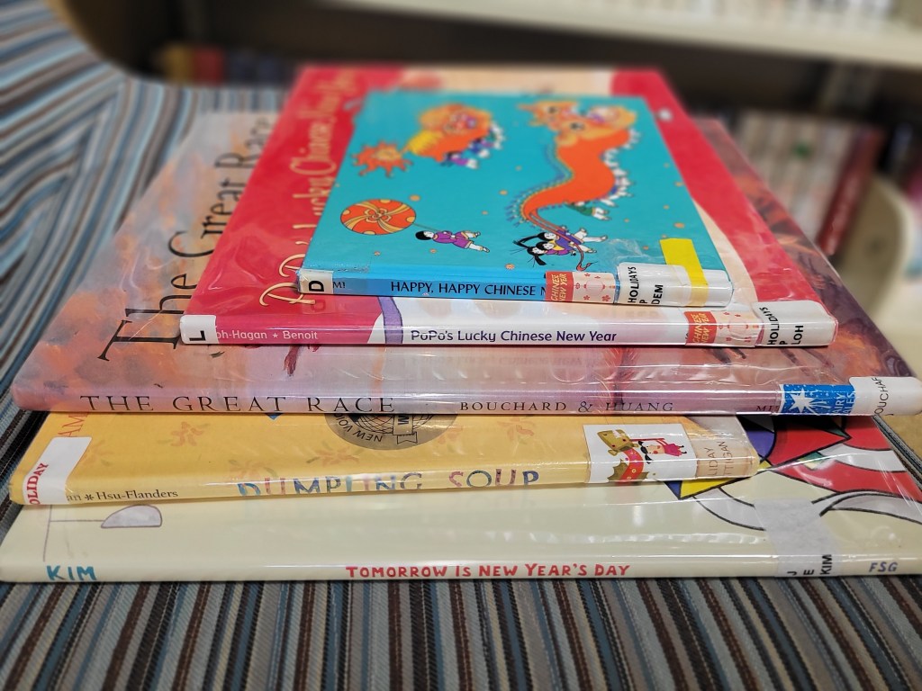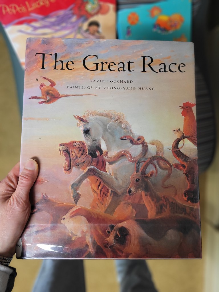 One book we usually revisit each year at the library is The Great Racewritten by David Bouchard and illustrated by Zhong-Yang Huang. This is a gorgeous retelling of the myth behind the Chinese zodiac. This book begins with a grandmother helping her granddaughter arrange cutouts of the zodiac animals and then telling her the story of the race to explain the order that the animals are placed in. The zodiac is important for the new year because each year represents an animal on the twelve-part zodiac calendar. The illustrations in this book are beautiful. The jacket note describes Huang’s style as a melding of Western influences with traditional Chinese painting and that description fits well. My kids are all very interested in the zodiac and learning about their own zodiac animals (your zodiac animal is the animal from the year in which you are born). For a while my daughter would introduce herself to kids at the playground and then follow it up with, “I’m a monkey for the Chinese zodiac! What’s your animal?” There were many confused children to say the least. (In the past my kids have enjoyed a fun Sagwa episode about the great zodiac race. Sagwa was a kid’s PBS show in the early 2000’s, based on Amy Tan’s picture book Sagwa the Chinese Siamese Cat.)