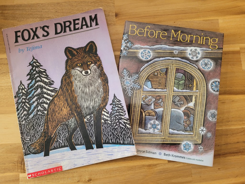 Snow creates a brief, still sanctuary for contemplative thought in Fox’s Dream by Tejima. This book tells the story of a lone fox awaking in a moonlit snow- and ice-covered forest. On his slow meander through the trees the fox sees a single hare, but it disappears just as quickly with a leap through a clearing. The hare jumping with the dark sky backdrop makes a dramatic two page spread in the book. I love the creative use of line, texture and shadow in the illustrations. As the fox wanders, he deals with feelings of loneliness and reflects on his time as a cub, the past closeness of his family, and the warmth of spring and summer. As the fox heads back home through the woods, he meets another fox, a vixen. They share a joyful greeting and the internal knowledge that spring will come again.